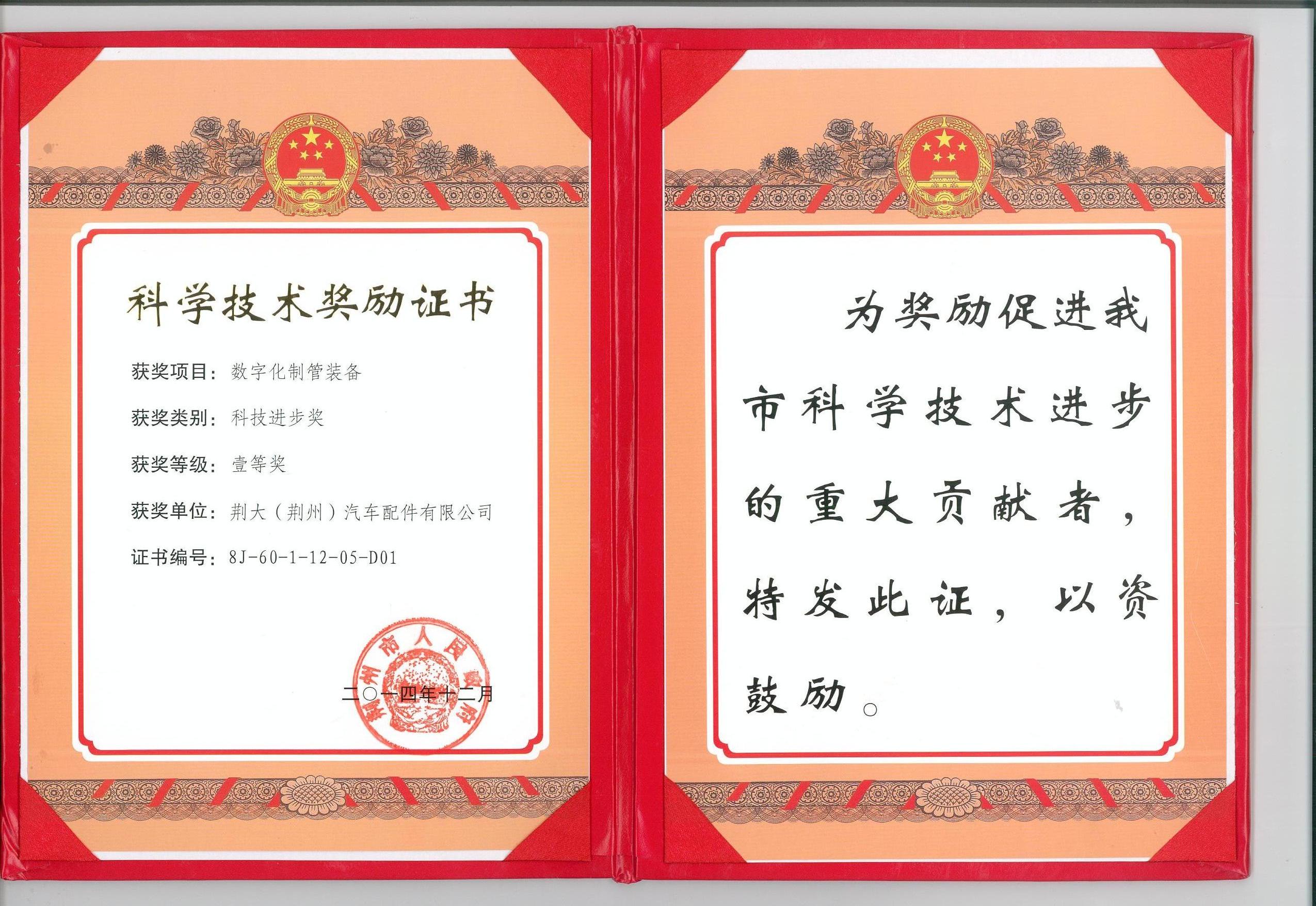 《數(shù)字化制管裝備》獲得2014年荊州市科技進步一等獎