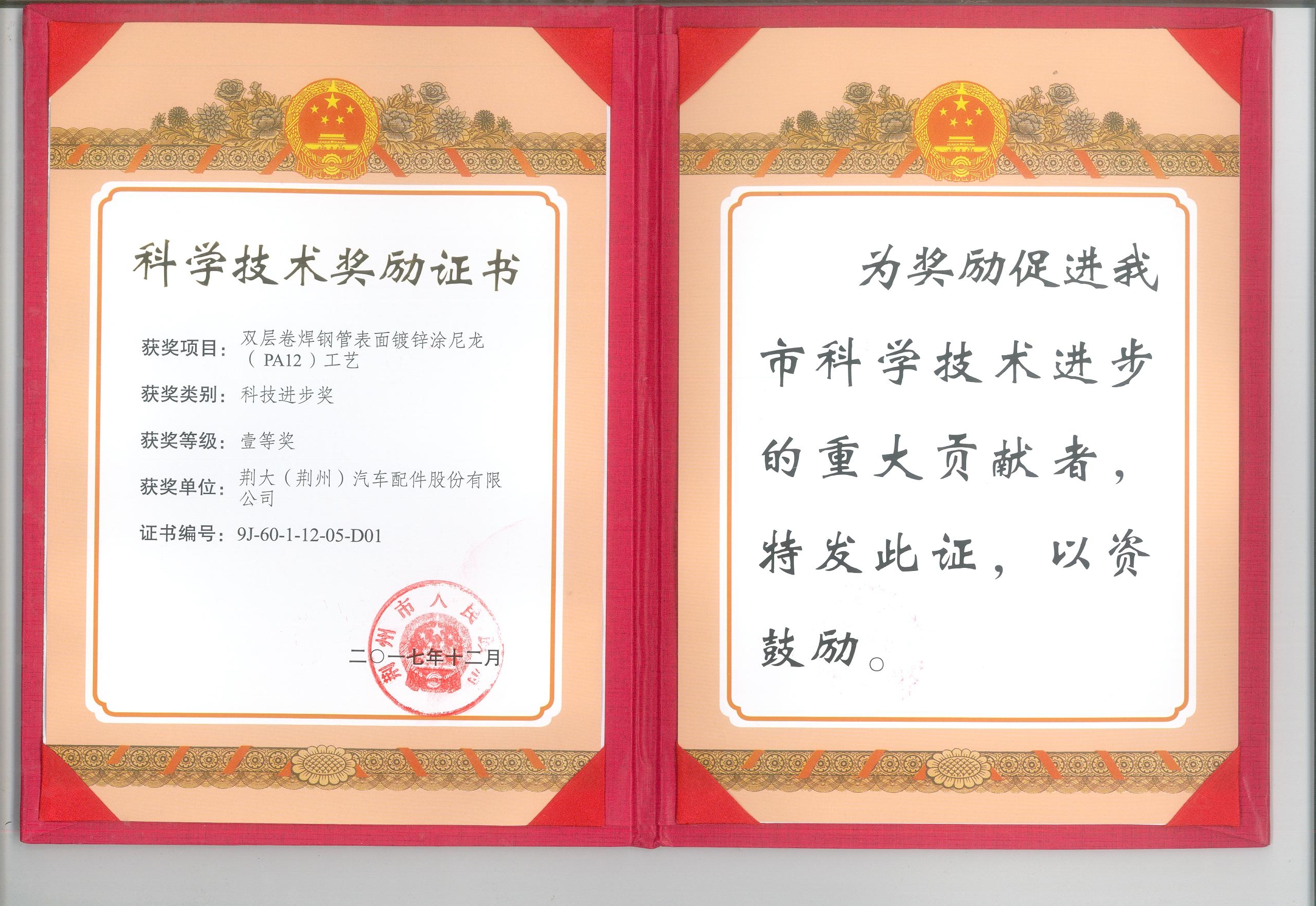 《鋼管涂尼龍工藝》獲得2017年荊州市科技進步一等獎
