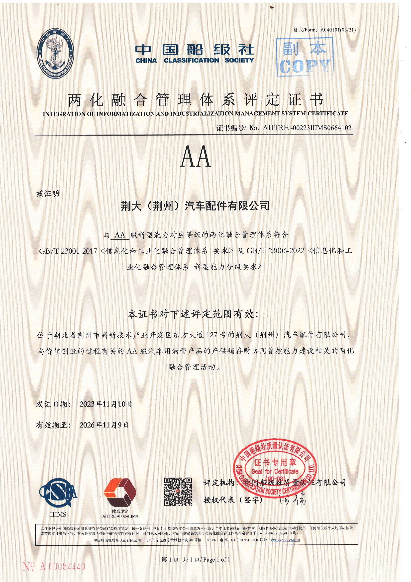 兩化融合2A管理體系證書
